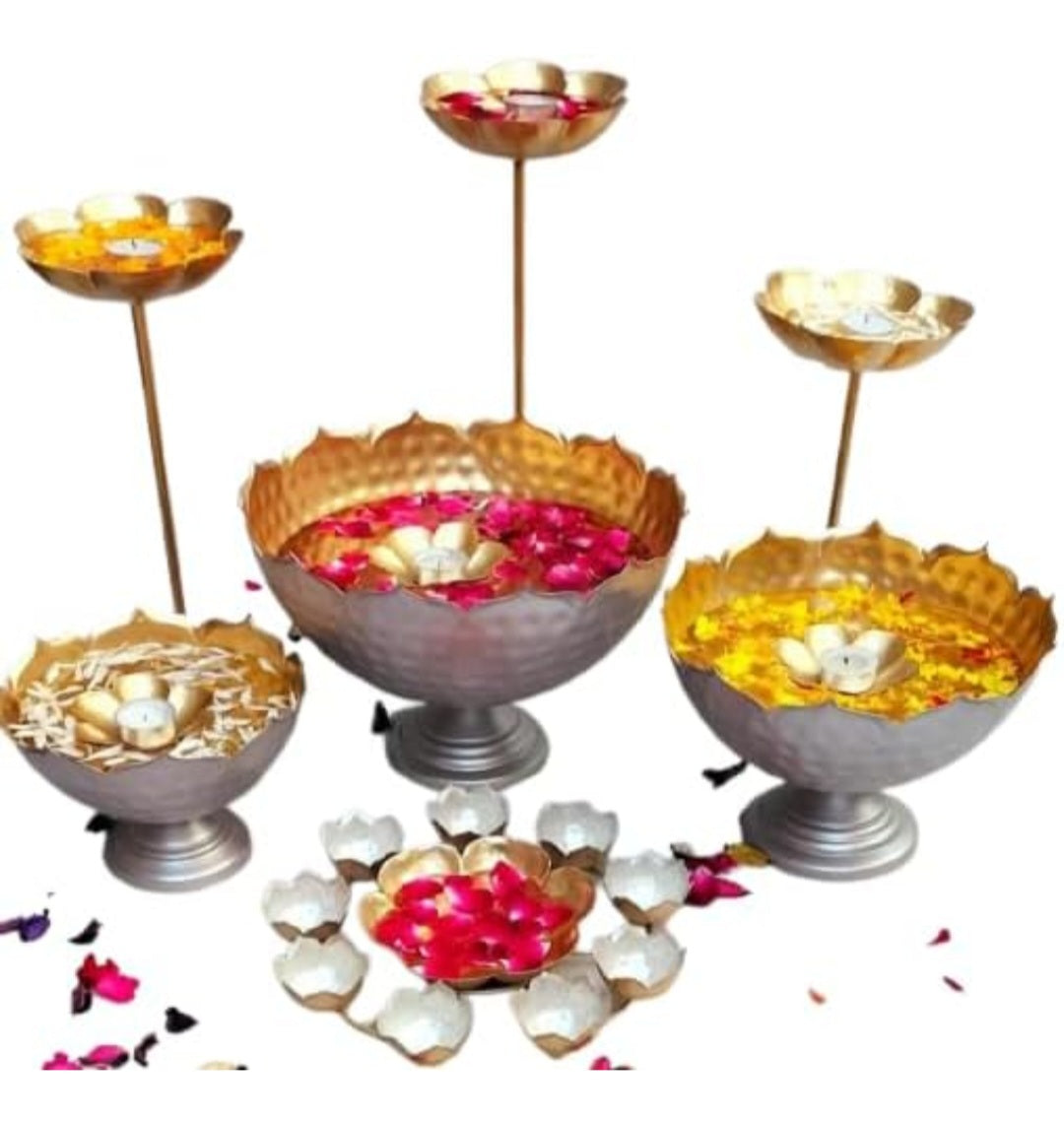 The Taj Urli with center Urli set is perfect for special events or home decoration. This set of 10 pieces comes with a unique center Urli and offers the perfect addition to any décor. The pot-shaped Urlis feature intricate designs and offer a pleasant glimmer in the light.